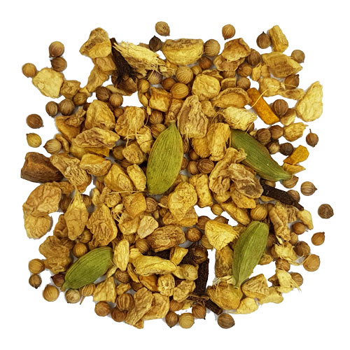 Джинджифил, кардамом, кориандър, корен от куркума, карамфил, индийско орехче.